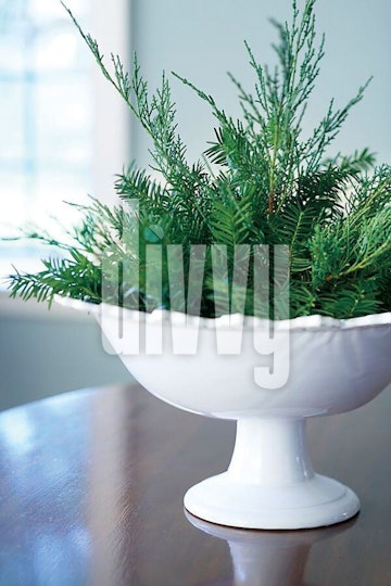 Evergreen branches arranged in a white bowl with pedestal sits on top of wood table.