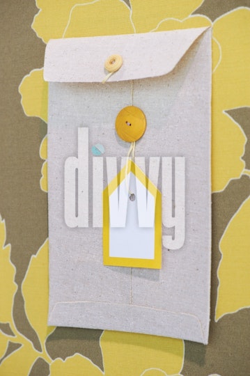 Gray fabric folder with a yellow name tag helps with organization in a home office space.