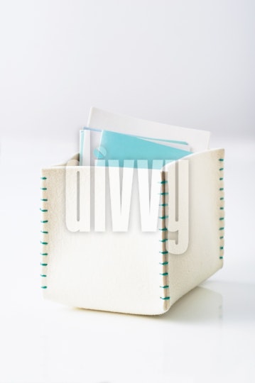 Notebooks fill a white felt storage box sewn with teal stitches.