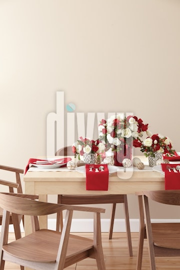Holiday themed table set with red napkins and a centerpiece arrangement of red and white roses.