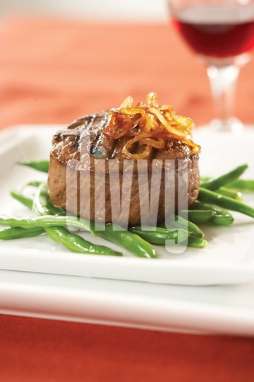 A portion of filet mignon is topped with caramelized onions and served with top of green beans.