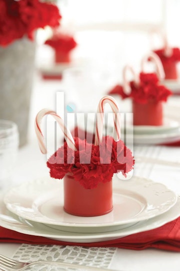 Individual red and white place settings are decorated with painted cans containing red carnations and two candy canes.