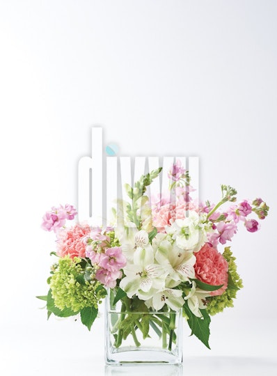 White tiger lilies and pink carnations are part of a floral arrangement displayed in square glass vase on a white surface.