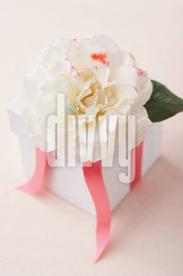A floral favor box is adorned with a ribbon and a large white faux flower with bright, deep pink accents.