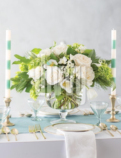 White roses and greenery in a clear vase sits as a centerpiece between two green and white striped candles, surrounded by white plates with gold trim and gold flatware.