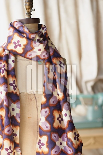 A floral-patterned scarf is draped around the neck of a sewing mannequin.