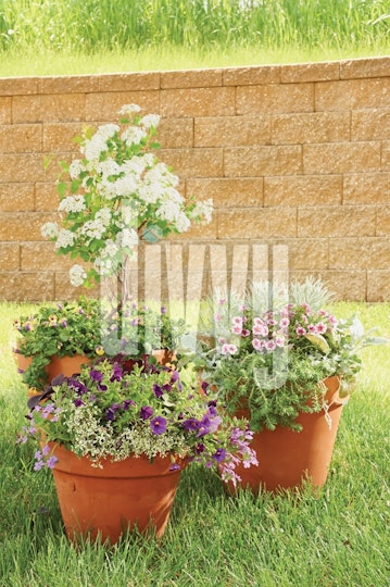 Three large terra cotta flower pots are arranged for a container garden in a grassy backyard.