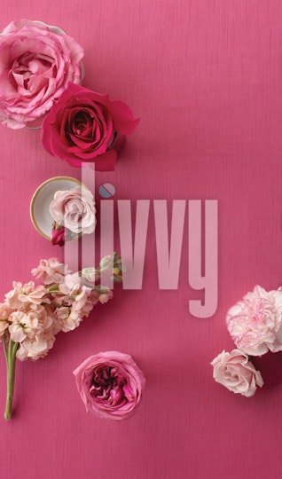 Assorted pink flowers rest on a hot pink silk tablecloth.