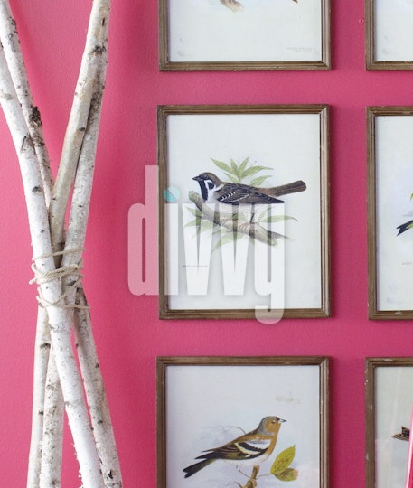 Framed vintage bird prints hang on a hot pink wall next to a group of birch branches.