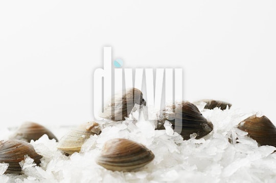 Fresh clamshells are arranged on crushed ice in front of a white background.