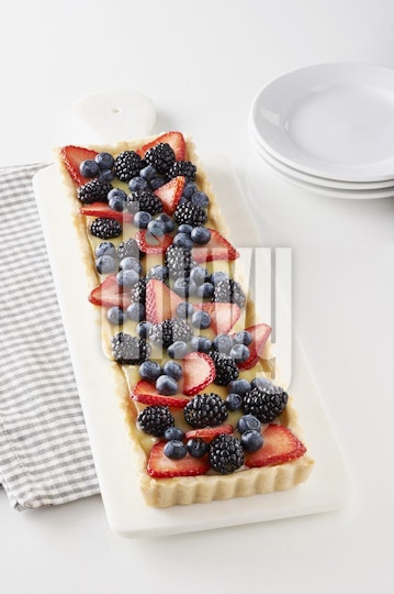 A fresh fruit tart filled with lemon curd is topped with whole blackberries and blueberries and sliced strawberries and served on a plate on a gray and white striped napkin.