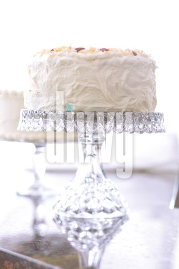 A white frosted cake is served on a glass cake stand on a brown stone countertop.