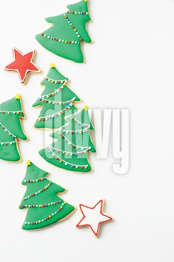 Five Christmas tree sugar cookies and two star-shaped sugar cookies are decorated with green, red, and white royal icing are arranged on a white background.