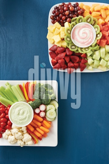 A fruit platter with a creamy fruit dip in the center and a veggie platter with a cucumber avocado party dip are arranged on a blue surface.