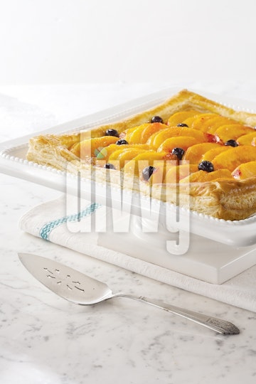 Peach slices and blueberries are baked into puff pastry and served on a square white cake stand next to a serving spatula.