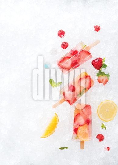 Fresh fruit pops rest on crushed ice with fresh berries, citrus and mint scattered around them.