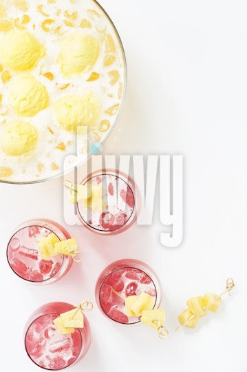 A large punch bowl is filled with a fizzy party punch with scoops of sherbet next to four glasses filled with sparkling lemonade fruit punch and garnished with pineapple skewers.