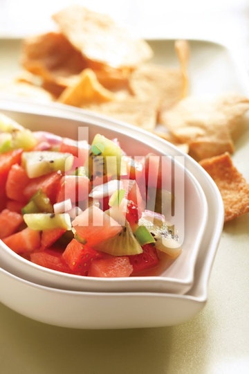 Watermelon fruit salsa is served in a white bowl on a surface with scattered pita chips.