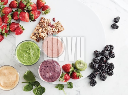Four fruit smoothies are surrounded by fresh strawberries, kiwis, blackberries, spinach and granola bars on a round, white plate on top of a marble countertop.