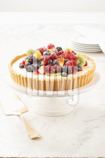 A gluten-free fruit tart is served on a white cake stand with a gold cake server on a marble counter.