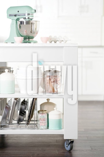 Ingredients are mixed in a mint-green stand mixer on top of an island where baking pans, mixing bowls, and canisters are organized on shelves.