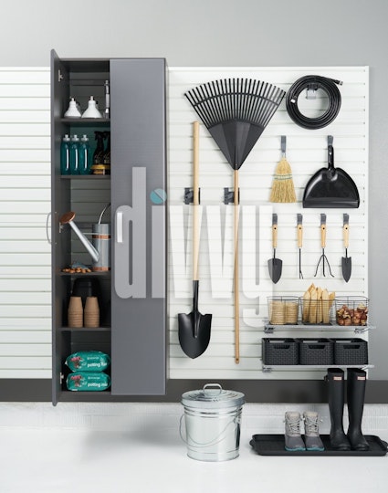 An organized garage uses hanging storage for gardening and yard tools and supplies and a cabinet for cleaning and planting supplies.