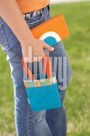 A girl in blue jeans and orange t-shirt carries an orange, white and teal journal and a small teal, orange and green striped bag.
