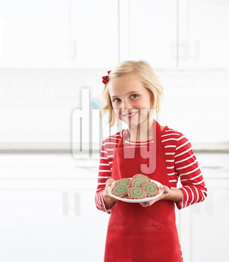A girl wearing a red apron holds up a plate of Christmas pinwheel cookies in a kitchen.