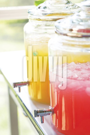 Two large glass beverage dispensers with spigots hold old fashioned lemonade and orange cooler beverages.