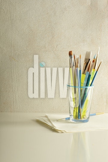 A tall glass holds clean paintbrushes on top of a stack of paper in front of a canvas background.