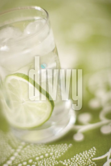 A glass of water with a lime slice rests on a green tablecloth.
