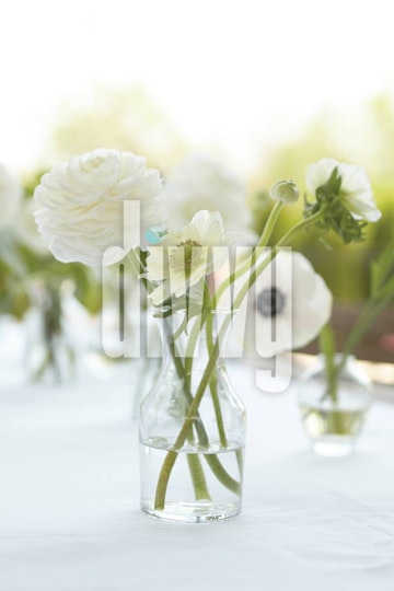 Small vases containing arrangements of a white rose, white anemone and white daisy fill an outdoor table.