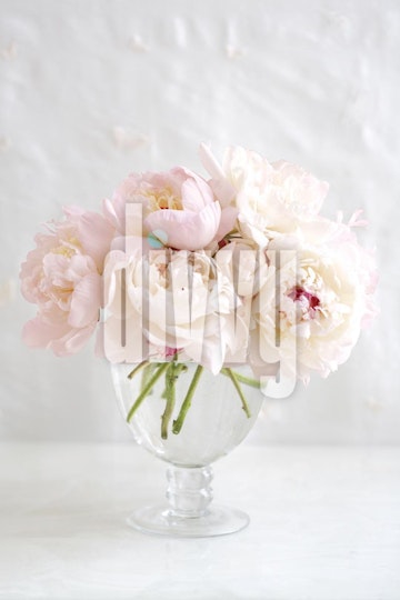 A bunch of light pink peonies gathered into a glass vase sits on a white background.