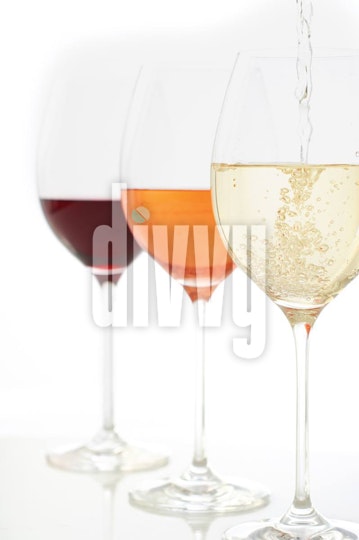 A glass of white wine being poured in the foreground, in front of a glass of rosé in the middle and a glass of red wine in the background.