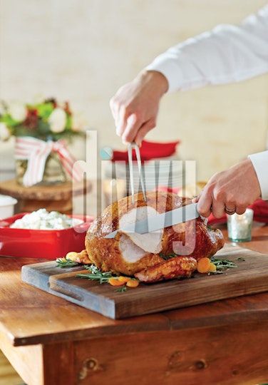 A man carves a glazed holiday turkey on a wooden cutting board in front of a spread of holiday foods.