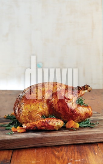 A golden glazed turkey rests on a cutting board garnished with rosemary sprigs and dried apricot.