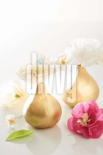 Two small gold vases contain bouquets of white and paper flowers next to pink and white paper flowers scattered on a white surface.