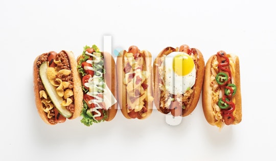 Five gourmet hotdogs are lined up on a white background, featuring toppings such as chili, corn chips, tomatoes, avocado, eggs, jalapeños, cheese, pickle, bacon and more.