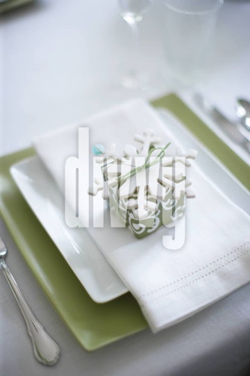 A green and white favor box topped with a snowflake sits on top of a place setting with a white linen napkin, white plate and green charger.
