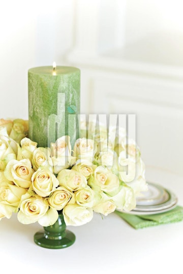 Green Candle Surrounded by Roses