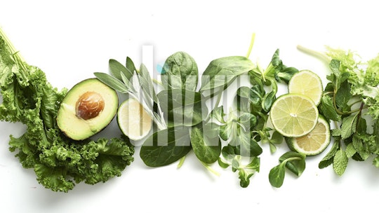 Assorted green fruits and veggies—kale, avocado, lime, sage, spinach, mache, mint and lettuce—are spread out across a white surface.
