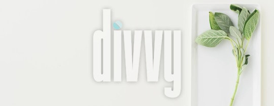 Single sprig of fresh sage rests on white rectangle plate on a white surface.