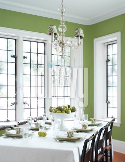 A green table is set on a white tablecloth, with a green apple centerpiece in a footed bowl.
