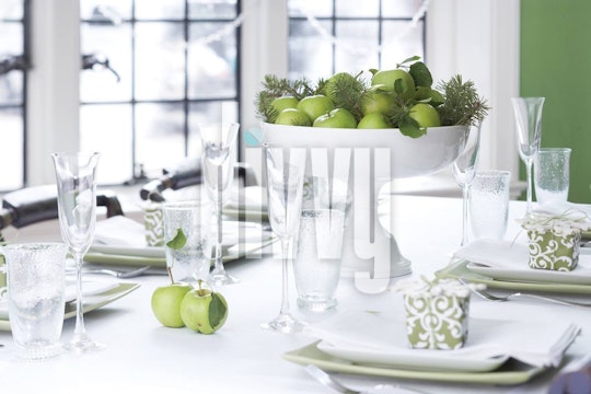 A holiday table is topped a with a centerpiece footed bowl filled with green apples and evergreen branches.