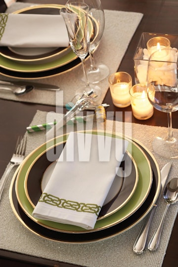 Green Table Setting with New Years Party Blowers