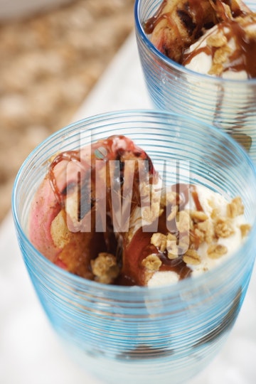 Grilled peaches are served with scoops of ice cream and topped with granola and caramel sauce.