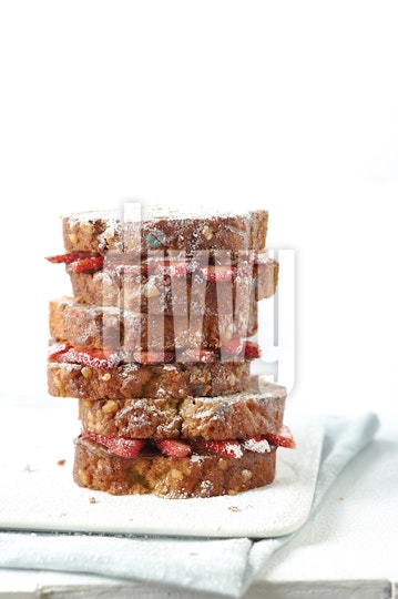 Grilled sandwiches made from banana bread and filled with sliced strawberries and hazelnut spread are stacked on a tray and dusted with powdered sugar.
