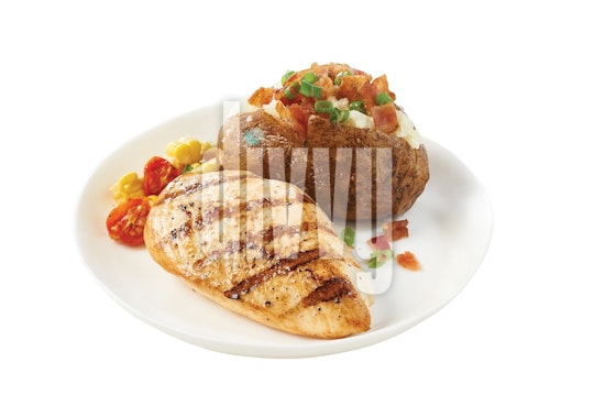 A grilled seasoned chicken breast is served with cooked sweet corn and tomatoes and a baked potato topped with bacon and fresh chives.