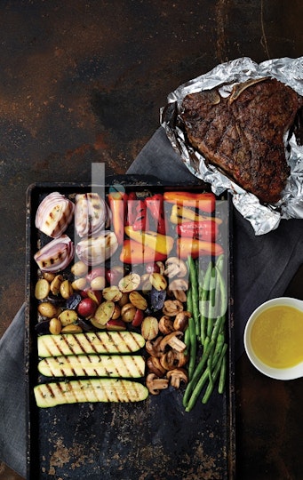 Grilled vegetables with fresh thyme including baby red potatoes, zucchini, green beans, baby bell peppers, red onions and mushrooms are served on a metal pan next to a T-bone steak wrapped in foil and a ramekin with a homemade vinaigrette.