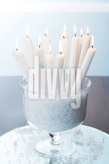 A group of lit white candles arranged with crystals inside a glass pedestal bowl arranged on a glass mirror on top of a wood table.